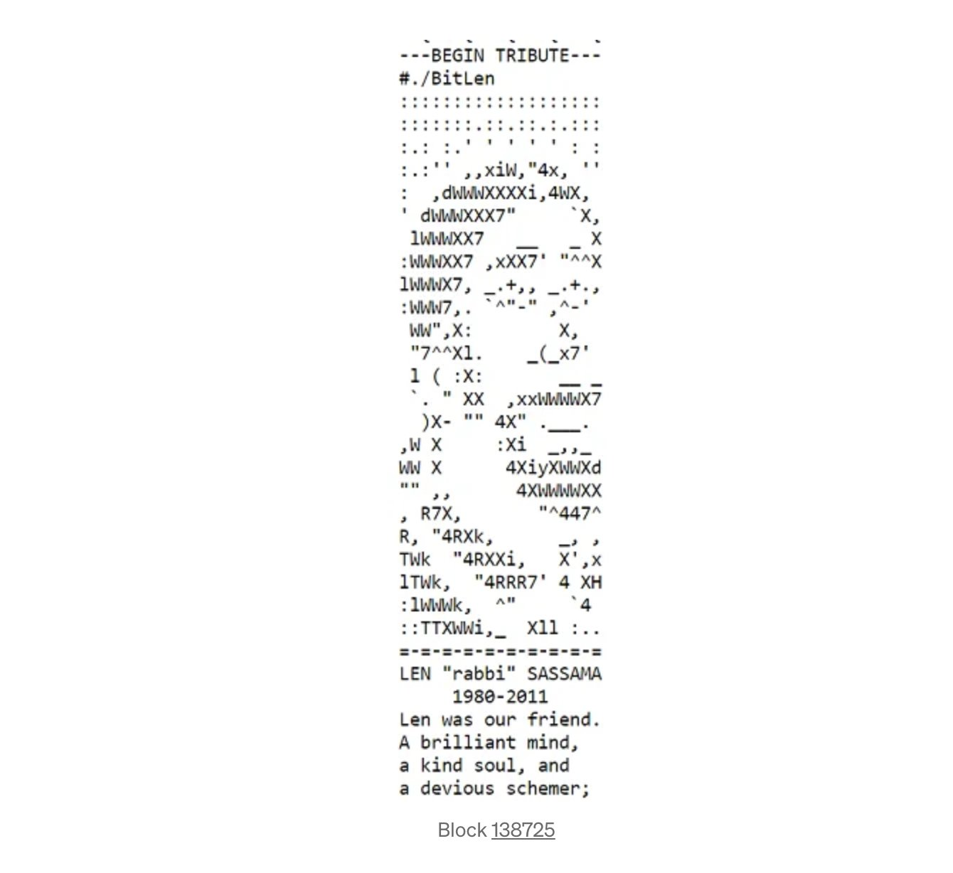 Il blocco Bitcoin presentava un’opera d’arte in memoria di Sassaman, consolidando il suo lascito all’interno della blockchain.