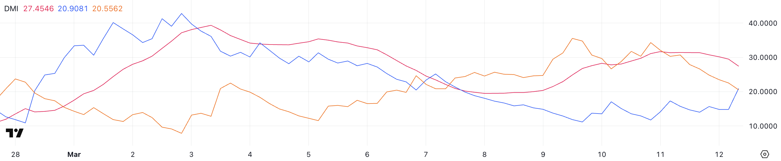 L’Average Directional Index (ADX) per HBAR è attualmente a 27,4, in calo rispetto a 31,4 di ieri, indicando che la forza del trend ribassista sta indebolendosi.