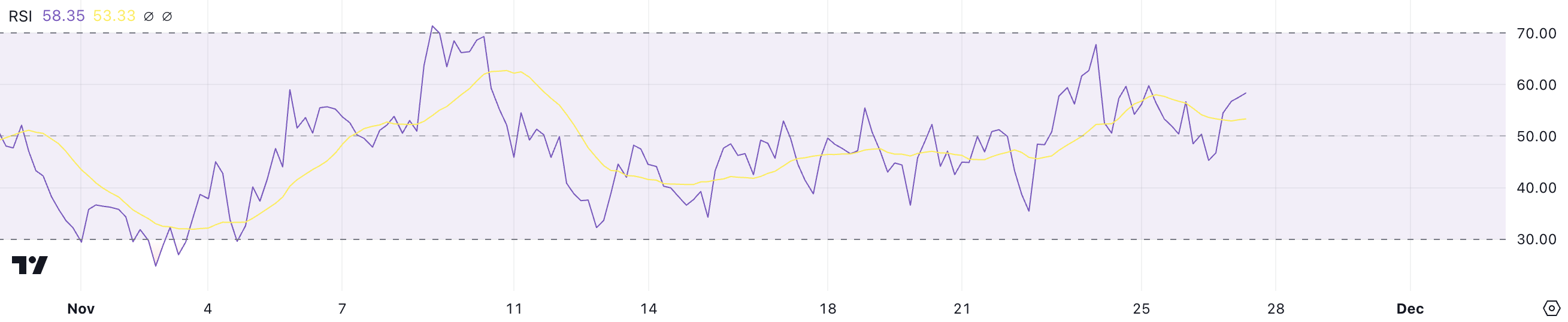 Valori sopra 70 segnalano condizioni di ipercomprato e una potenziale correzione, mentre valori sotto 30 indicano livelli di ipervenduto, spesso portando a un rimbalzo. Un RSI di 58 suggerisce che HNT è in un trend al rialzo sano senza avvicinarsi ancora al territorio di ipercomprato.