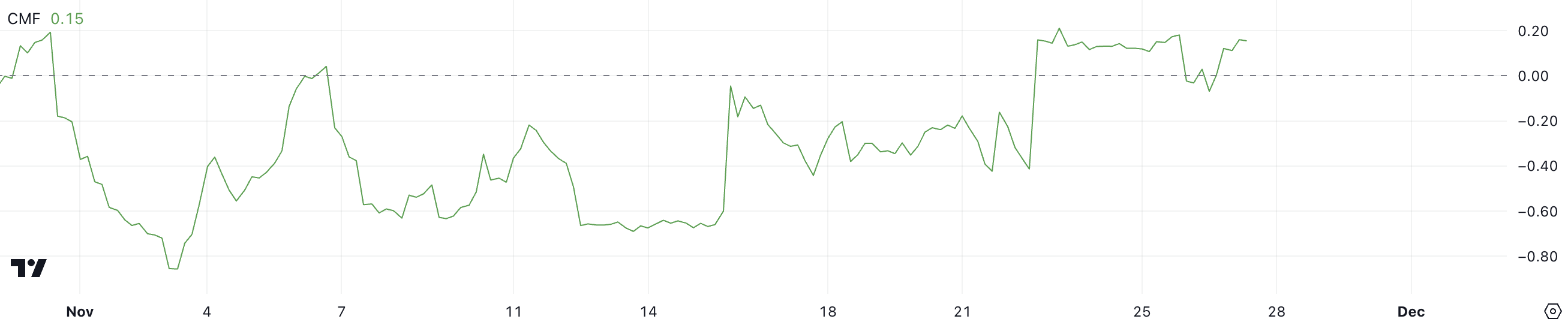 HNT CMF è salito a 0,15 da -0,06 in un solo giorno, segnalando un significativo spostamento verso una pressione d’acquisto positiva. Il CMF, o Chaikin Money Flow, misura il flusso di capitale in entrata o in uscita da un asset in un periodo specifico, con valori sopra 0 che indicano afflussi netti (dominanza d’acquisto) e valori sotto 0 che riflettono deflussi netti (pressione di vendita).