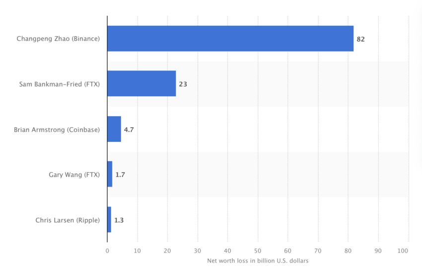 Secondo i dati di Statista, l’ex CEO della piattaformadiscambio Binance, Changpeng “CZ” Zhao, ha visto il suo patrimonio netto ridursi di 82 miliardi di dollari entro la fine del 2022, in seguito al crollo di una serie di società di criptovalute.
