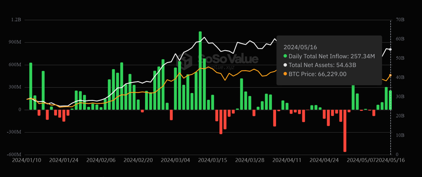 Allo stesso tempo, gli ETF spot statunitensi su Bitcoin hanno mostrato performance migliori. I dati di SoSo Value mostrano un afflusso netto totale di 257,34 milioni di dollari per gli ETF spot statunitensi su Bitcoin al 16 maggio. Si tratta del quarto giorno consecutivo di flussi positivi.