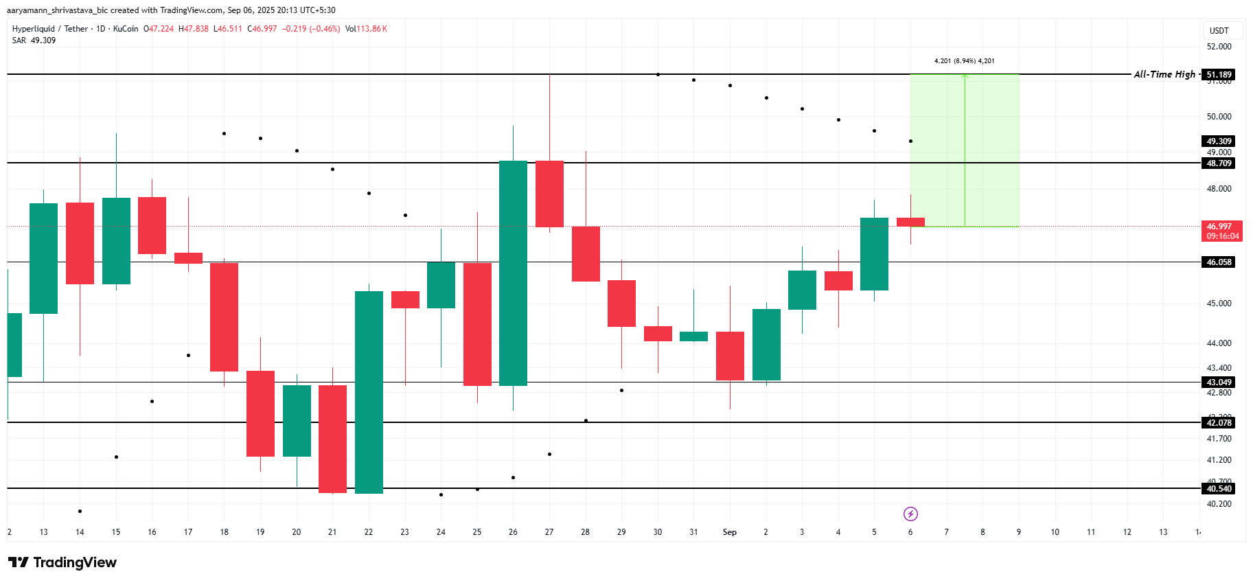 Attualmente scambiato a $46,99, HYPE è solo al 9% di distanza dal picco di $51,18 registrato a fine agosto. Gli indicatori di mercato suggeriscono che il momentum rialzista potrebbe continuare a rafforzarsi.