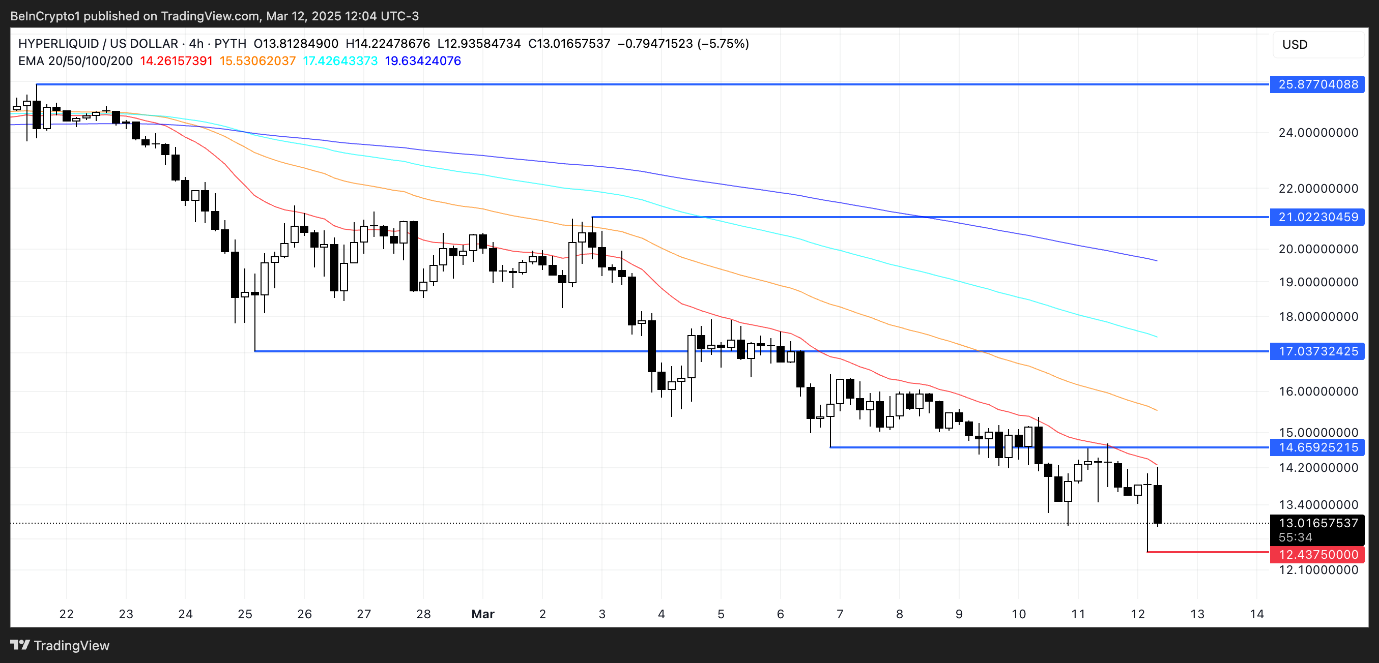 Hyperliquid è attualmente scambiato ai suoi livelli più bassi da dicembre 2024, con le sue linee EMA che segnalano un forte sentimento ribassista.