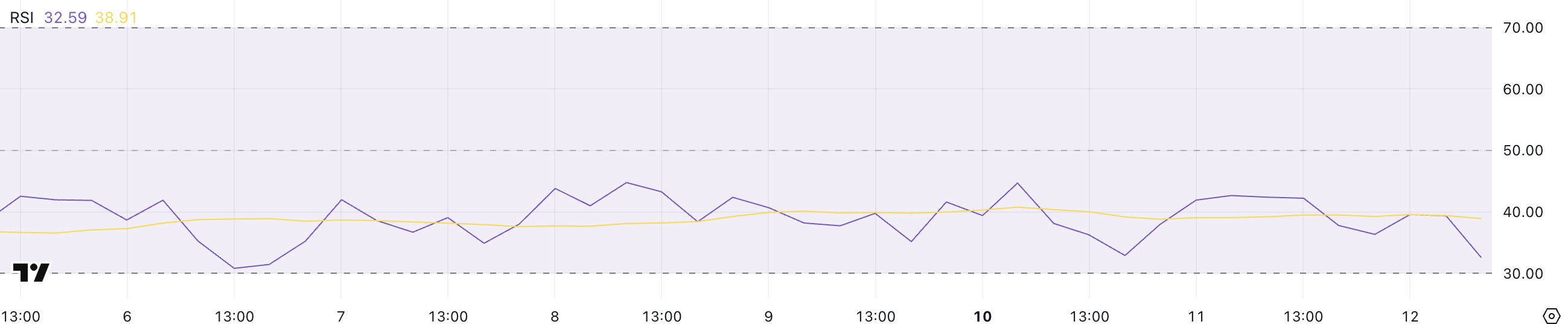L’RSI di HYPE è rimasto sotto 50 per nove giorni consecutivi, rafforzando la mancanza di momentum rialzista. Con la lettura attuale a 32,59, l’asset si sta avvicinando al territorio di ipervenduto ma non ha ancora raggiunto livelli estremi.
