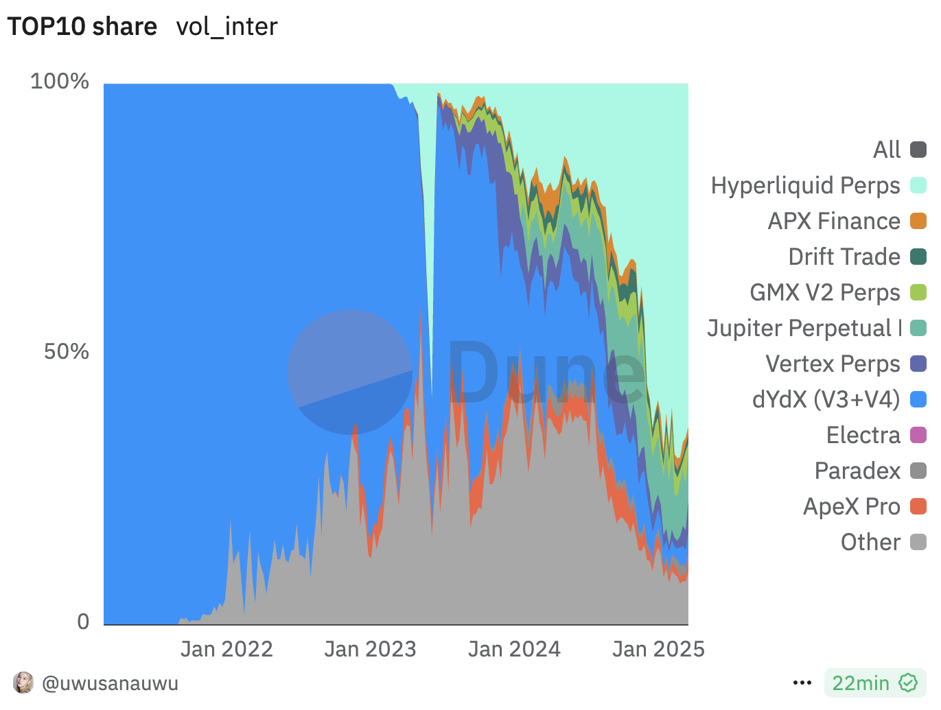 Inoltre, come riportato da Dune Analytics, i volumi settimanali hanno oscillato tra 40 miliardi di dollari e 50 miliardi di dollari. Infatti, la piattaforma ora detiene oltre il 60% della quota di mercato tra le piattaforme perps, consolidando la sua posizione come potenza nella finanza decentralizzata (DeFi).