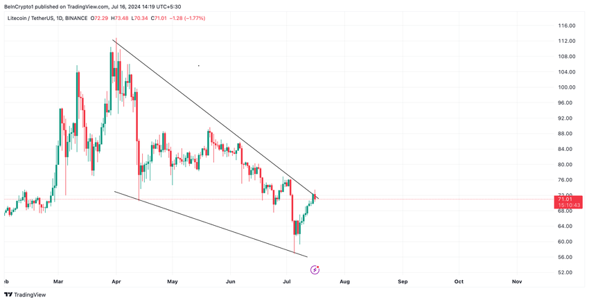 Ieri il Litecoin (LTC) ha chiuso al di sopra del suo schema a cuneo cadente, segnalando un’impennata della pressione d’acquisto. L’altcoin scambiava all’interno di questo pattern dal 31 marzo.