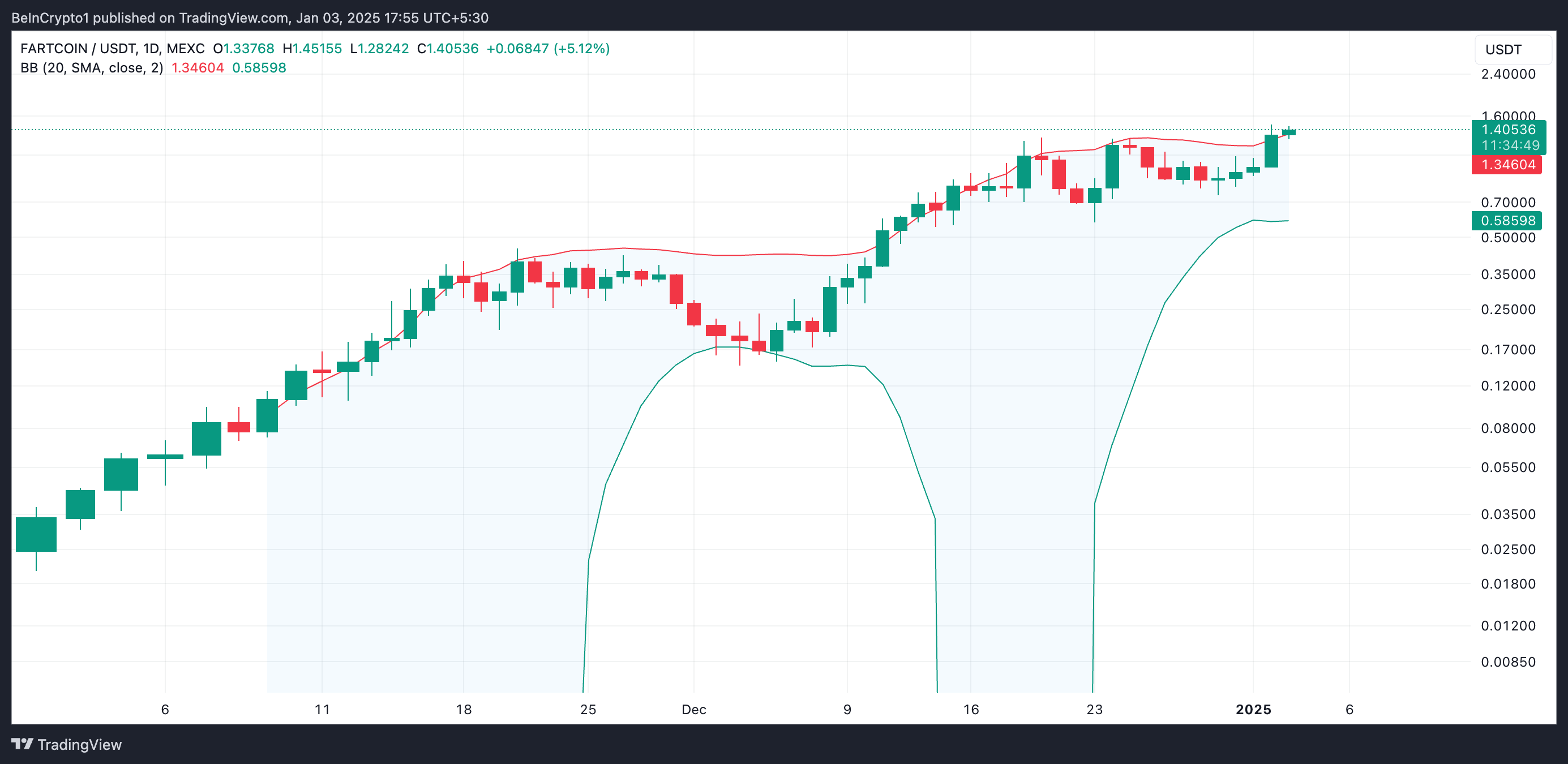 La valutazione di BeInCrypto del FARTCOIN/USD sul grafico giornaliero mostra che l’altcoin ora viene scambiato sopra la linea superiore del suo Indicatore delle Bande di Bollinger.