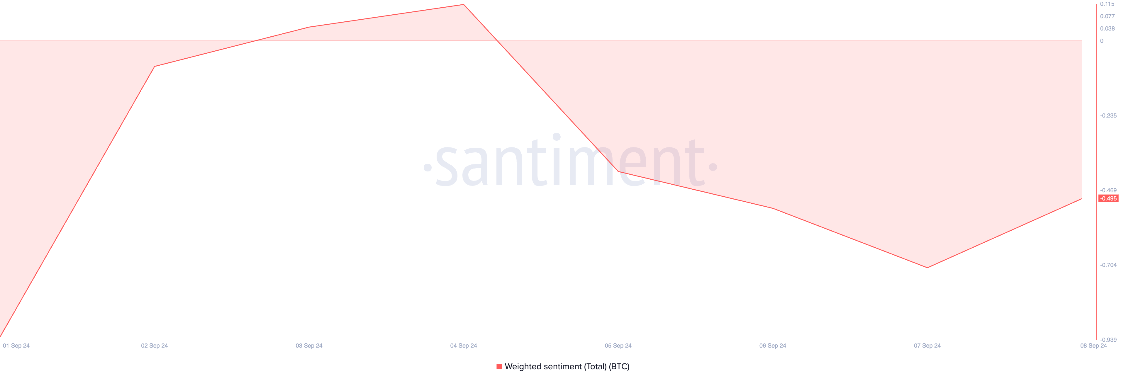 Il sentimento ponderato negativo intorno a Bitcoin da quando sono iniziate le vendite dei minatori aumenta l’incertezza del mercato. Attualmente, questo indicatore del sentimento, che misura l’umore generale del mercato, è a -0,49.