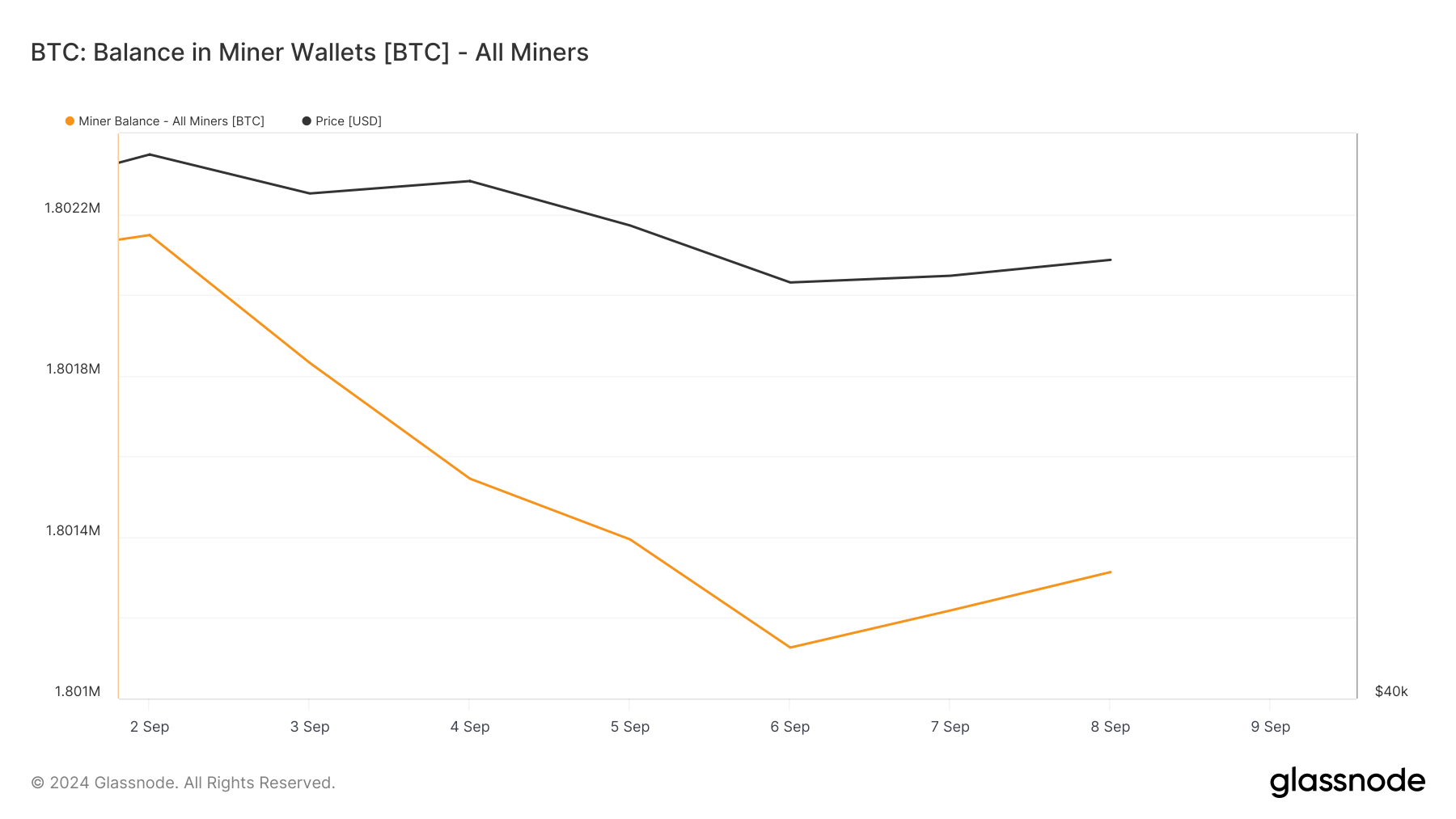 I dati di Glassnode mostrano un calo graduale dei saldi dei minatori di Bitcoin dal 2 settembre. Questo indicatore traccia il numero totale di monete detenute dai minatori sulla rete BTC. Attualmente, 1,8 milioni di BTC, valutati a circa 99 miliardi di USD ai prezzi di mercato attuali, sono detenuti negli indirizzi dei minatori.