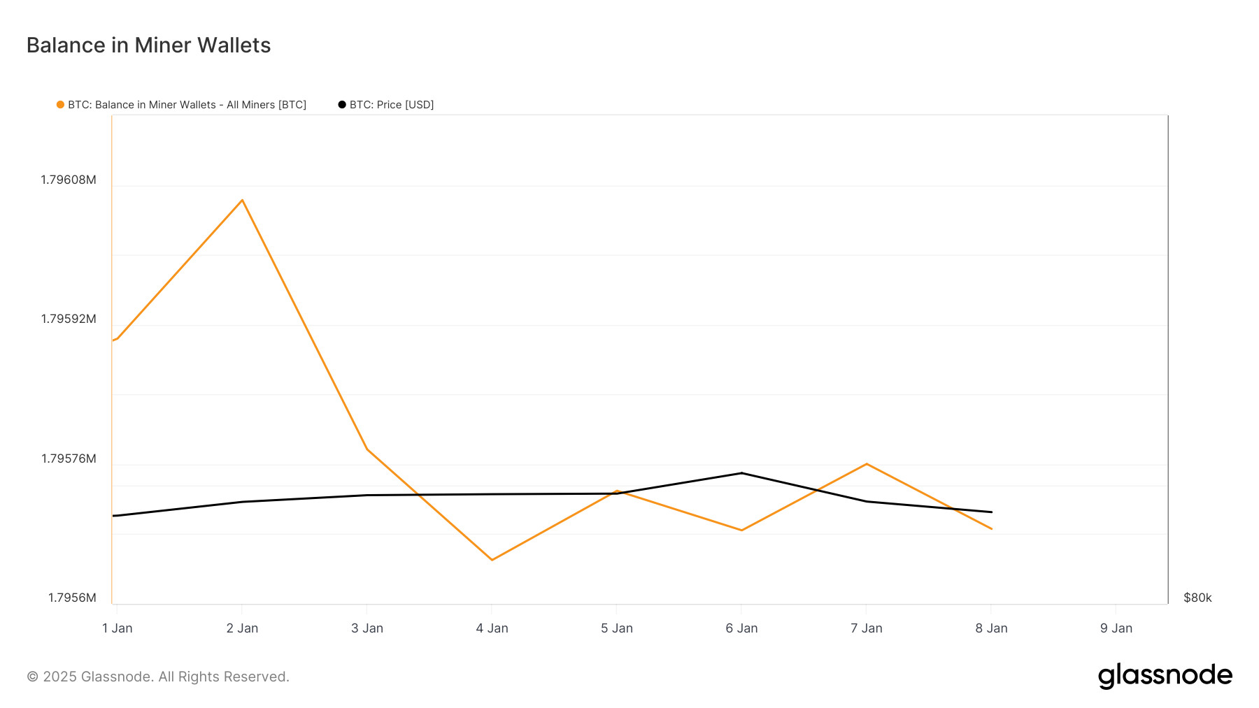 Con più miner di Bitcoin che si affrettano a vendere le loro monete per prevenire ulteriori perdite nei loro possedimenti di BTC, la quantità di BTC detenuta nei portafogli dei miner è diminuita costantemente. Al momento della scrittura, questo ammonta a 1,79 milioni di BTC, un calo di 0,005% dal 2 gennaio.
