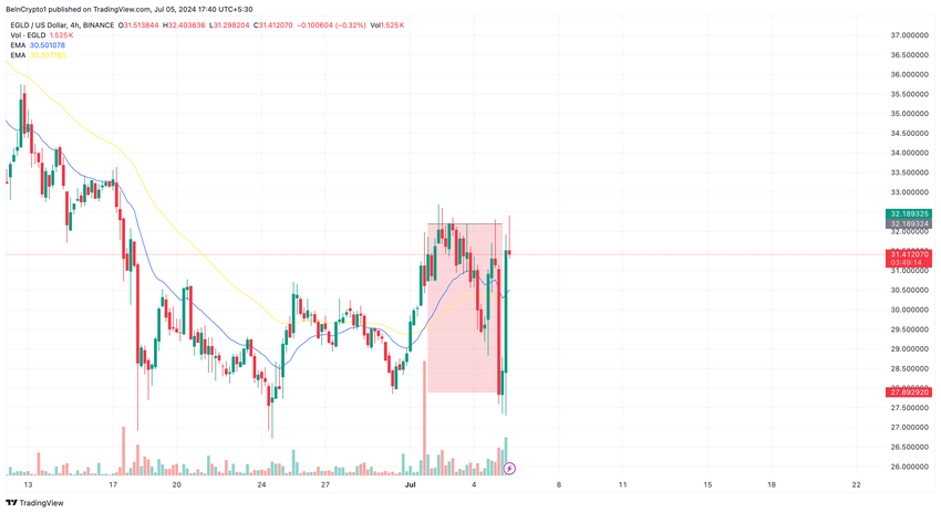 All’inizio della settimana, il prezzo di EGLD è salito a 32,18 dollari. Ma il 3 luglio il prezzo è sceso a 29,43 dollari. Alla fine i rialzisti non sono riusciti a difendere il supporto, scendendo a 27,87 dollari.