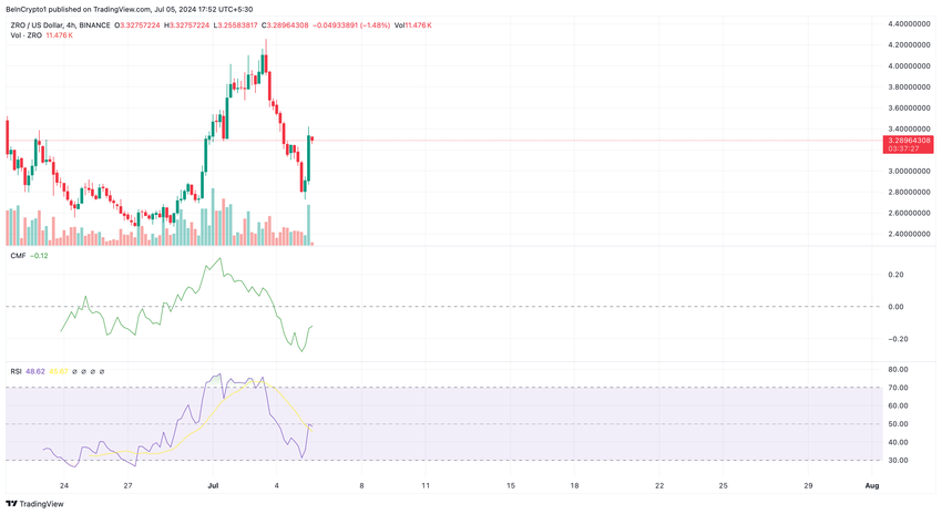 Secondo il grafico a 4 ore, ZRO era in ipervenduto il 5 luglio. Durante questo periodo, l’Indice di Forza Relativa (RSI), che misura lo slancio, era inferiore a 30.00. Il Chaikin Money Flow (CMF), che traccia l’accumulazione e la distribuzione, conferma la pressione di vendita in quel momento.
