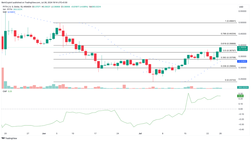 Recentemente, BeInCrypto ha riportato che l’open interest di PYTH ha raggiunto un massimo di due settimane, confermando che l’attenzione è stata rivolta all’altcoin. Negli ultimi sette giorni, il prezzo del token è salito del 15,12%, rendendolo uno dei principali guadagnatori di altcoin dell’ultima settimana di luglio 2024.