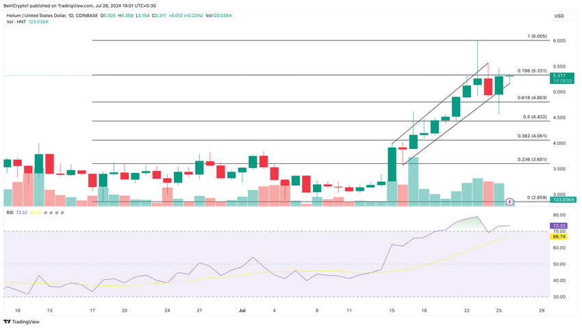 Al momento della stampa, HNT scambia a 5,30 dollari dopo aver registrato un aumento del 23,76% negli ultimi sette giorni. Secondo il grafico giornaliero, HNT ha subito un calo il 16 luglio, quando il prezzo è sceso a 3,57 dollari. Questo è stato l’inizio del trend rialzista, che ha visto il prezzo salire fino a 6 dollari.