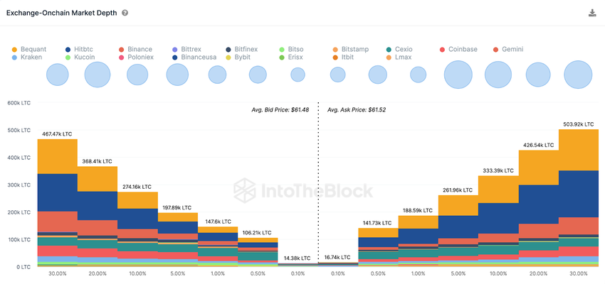 Come si vede sopra, gli ordini di vendita di Litecoin superano di gran lunga la domanda del mercato di 800.000 LTC. Ciò suggerisce che i day trader di LTC non sono ancora convinti di una ripresa dei prezzi.