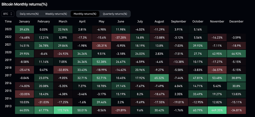 La schermata sottostante mostra che ottobre è storicamente un mese rialzista per il Bitcoin. Dal 2013, il BTC ha registrato rendimenti negativi solo due volte, nel 2014 e nel 2018.