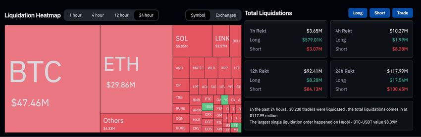 Secondo i dati di Coinglass, nelle ultime 24 ore i trader hanno perso oltre 117,99 milioni di dollari in liquidazioni. Sebbene siano state liquidate anche alcune posizioni lunghe, la maggior parte delle perdite è derivata dalle posizioni corte.