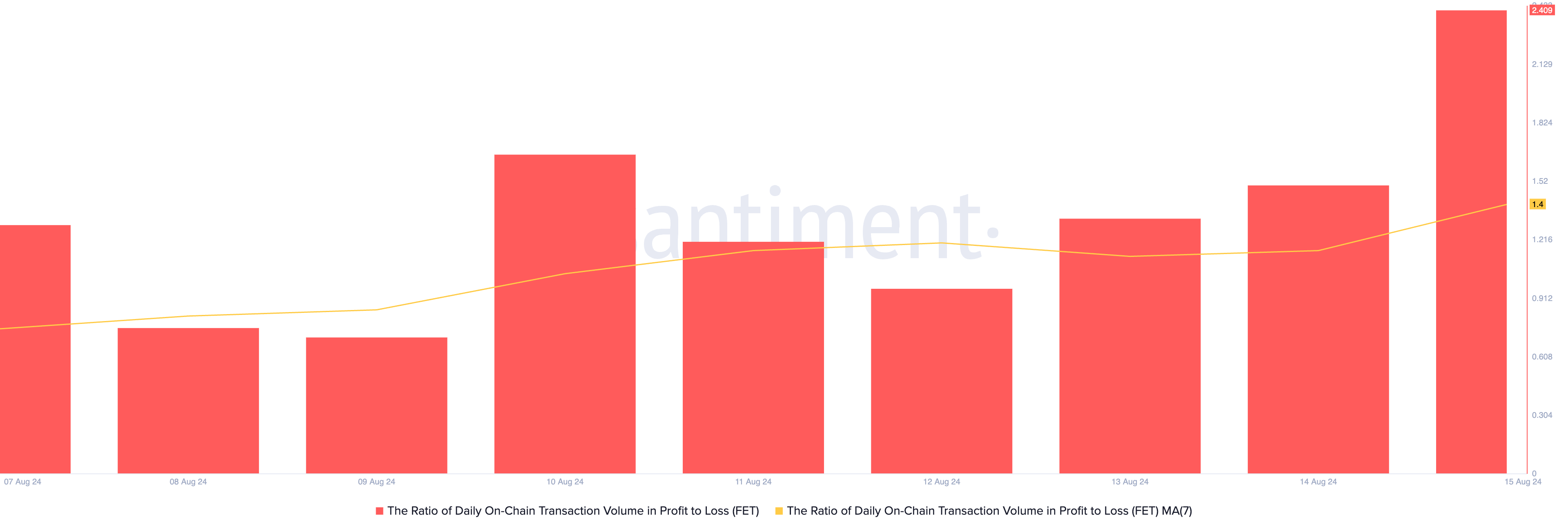 Al momento in cui scriviamo, FET scambia a 0,84 dollari, segnando un aumento del 3% negli ultimi sette giorni. L’analisi del rapporto del volume delle transazioni giornaliere sul blockchain tra profitti e perdite rivela che la maggior parte dei trader ha ottenuto guadagni in questo periodo. Giovedì, la metrica ha raggiunto 2,40, il livello più alto dal 27 luglio.