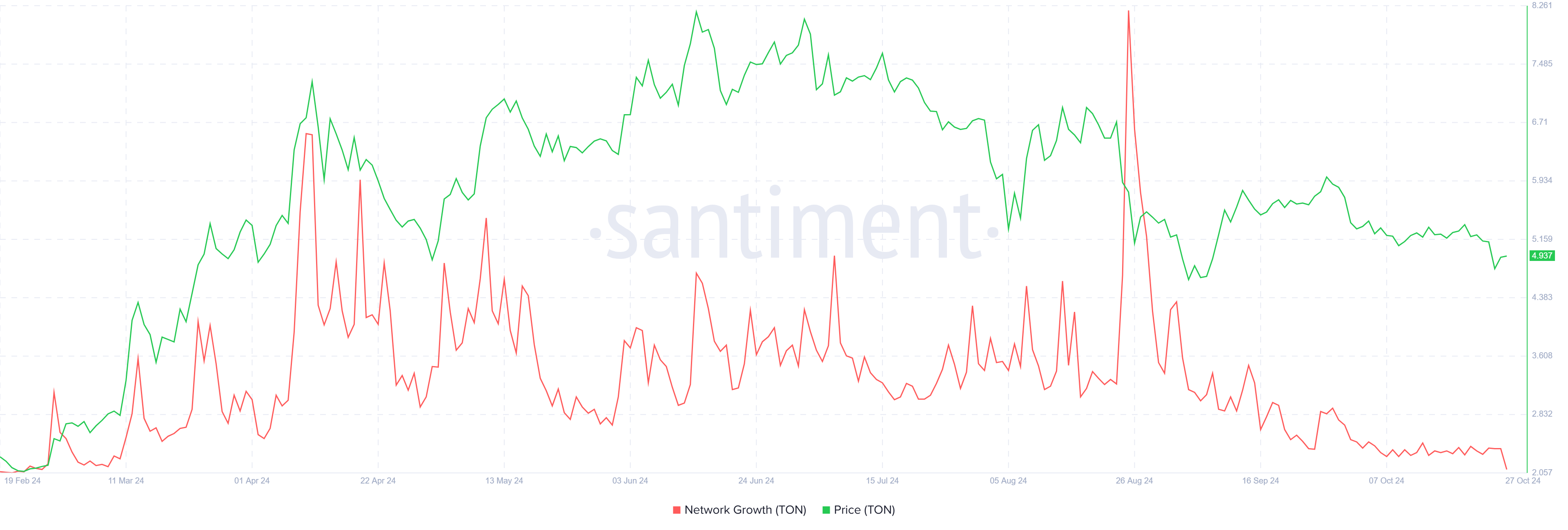 La crescita della rete di Toncoin ha subito un forte calo, con l’adozione che ha raggiunto il minimo degli ultimi otto mesi. Questo indicatore, che misura il numero di nuovi indirizzi creati, è fondamentale per valutare se una criptovaluta sta guadagnando o perdendo interesse di mercato. Il calo attuale implica che meno nuovi investitori e utenti si stanno unendo all’ecosistema TON, suggerendo una fiducia in diminuzione.