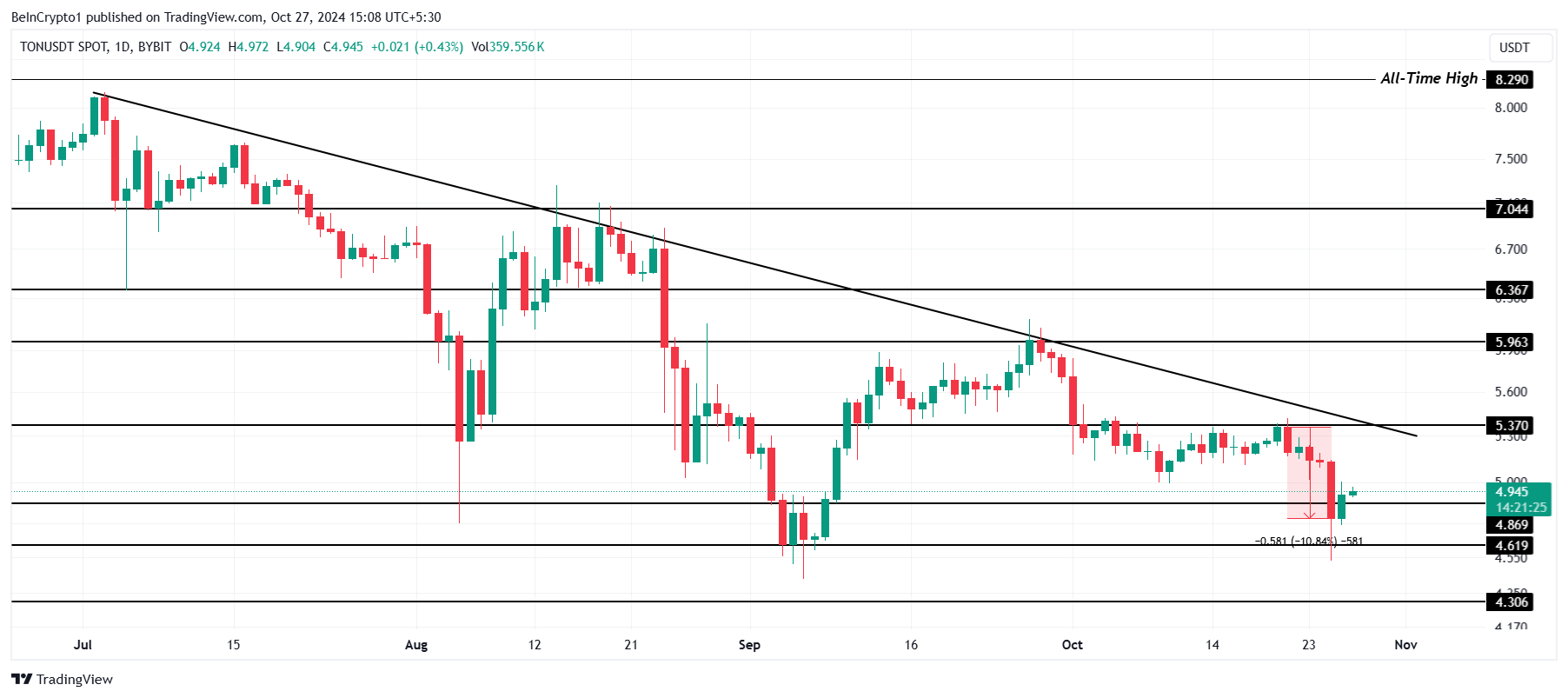 Nonostante le rally intermittenti, TON non è riuscito a uscire dalla traiettoria ribassista iniziata a giugno. Questo ha spinto il prezzo sotto livelli di supporto critici e potrebbe prepararlo a ulteriori cali.