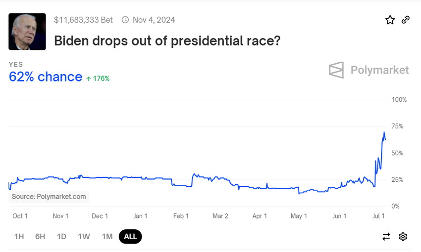 Dall’altra parte, il presidente Biden ha dovuto affrontare crescenti dubbi sulla sua capacità di competere alle elezioni di novembre dopo il suo scarso rendimento nei dibattiti contro Trump. Gli scommettitori di Polymarket ritengono che ci sia il 62% di possibilità che abbandoni la campagna elettorale, nonostante la sua insistenza a rimanere in gara.