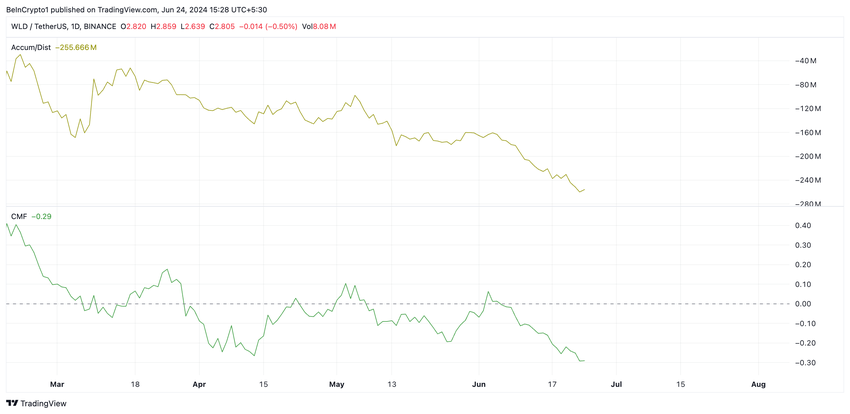 Inoltre, il Chaikin Money Flow (CMF) di WLD, che misura il flusso di denaro in entrata e in uscita dal mercato, è pari a -0,29 al momento della stampa.