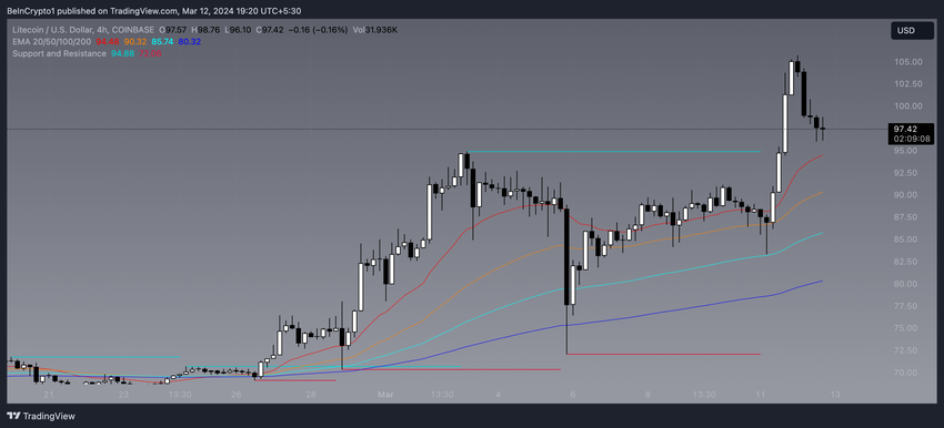Un’analisi del grafico del prezzo del Litecoin (LTC) prima del recente aumento del 40% rivela uno scenario interessante. La linea della media mobile esponenziale (EMA) a 200 giorni era posizionata in modo evidente più in basso rispetto alle linee EMA a breve termine e al prezzo attuale. Questa specifica configurazione tecnica, spesso interpretata come un segnale rialzista, ha coinciso con un rapido apprezzamento del prezzo dell’LTC da 86 a 105 dollari in un solo giorno di scambiare.