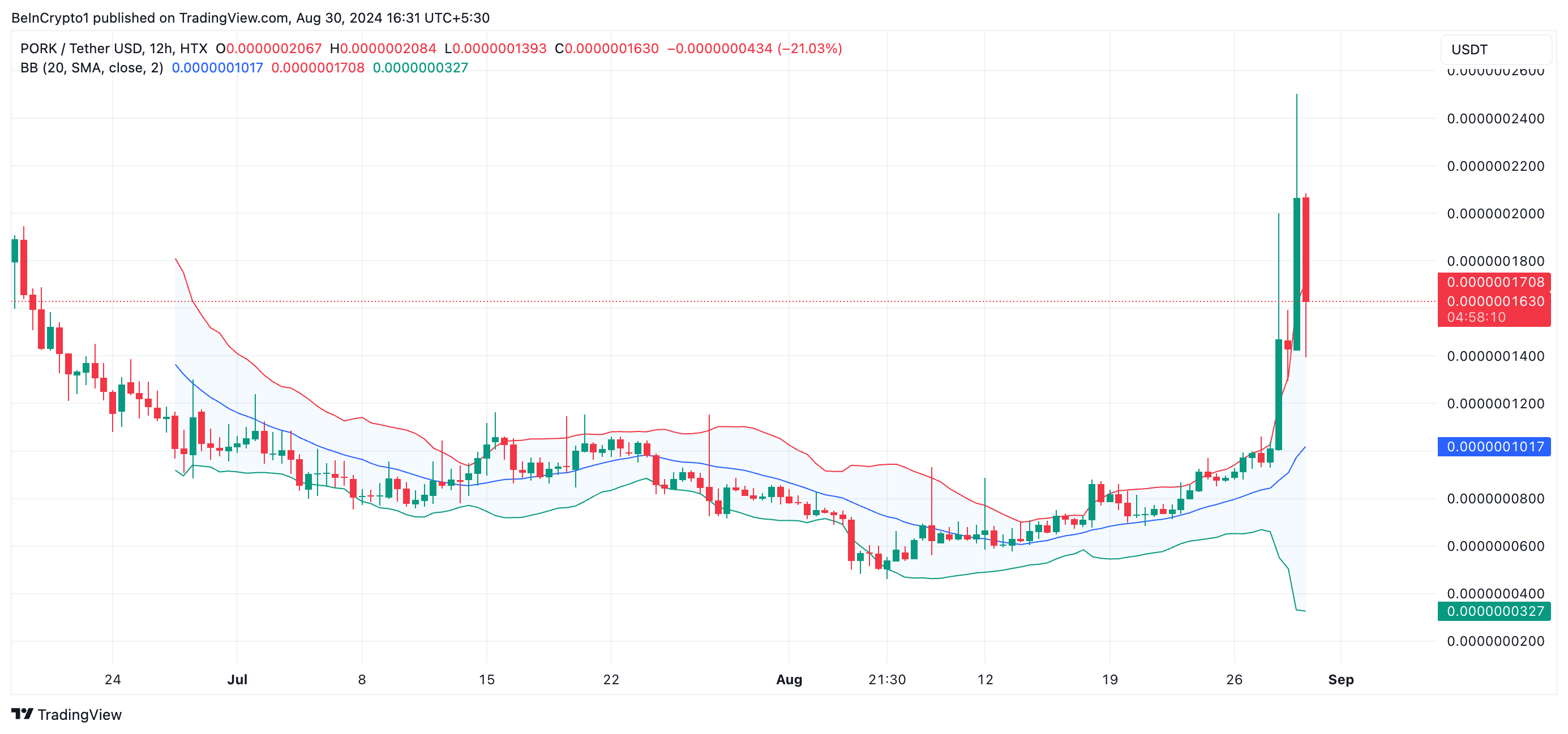 Inoltre, il Range Medio Vero (ATR) di PORK, che misura il grado di volatilità dei prezzi, è aumentato. Attualmente, l’ATR di PORK è di 0,0000000026, confermando ulteriormente l’alta volatilità che circonda la meme coin.