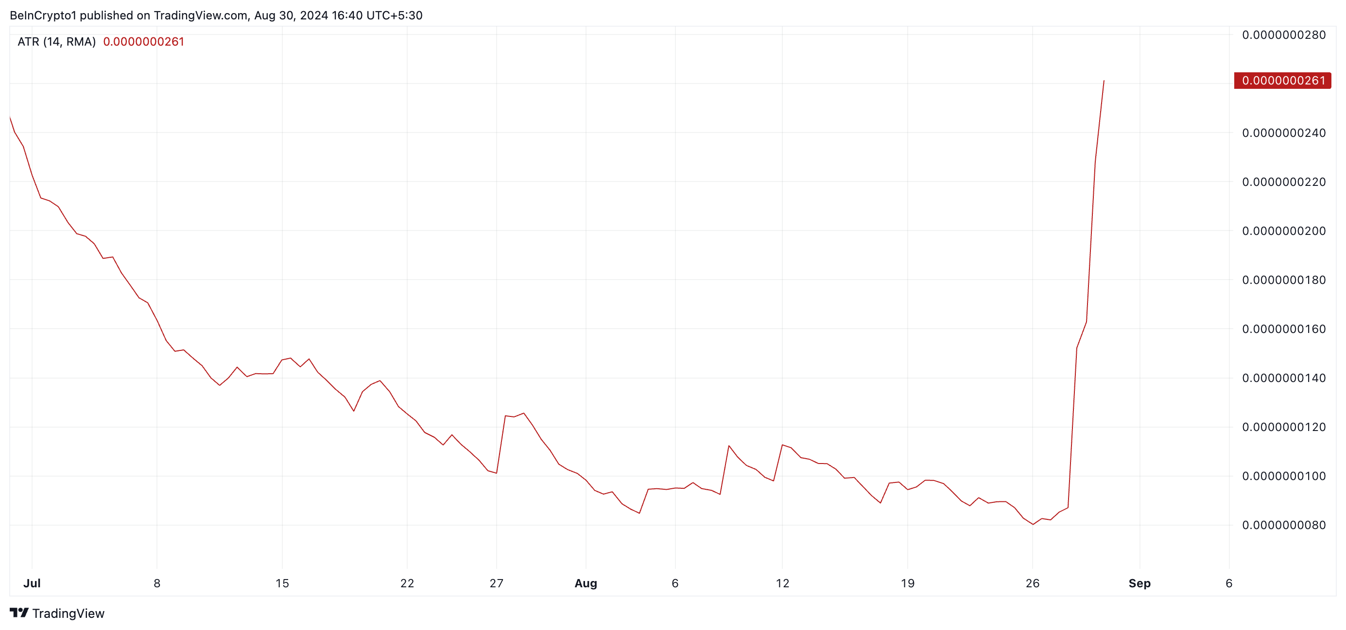 Un aumento del Range Medio Vero (ATR) indica che il prezzo di un asset sta vivendo fluttuazioni massicce. Questo suggerisce che l’asset è a rischio di ulteriori oscillazioni di prezzo, evidenziando la potenziale continuazione della volatilità nel breve termine.
