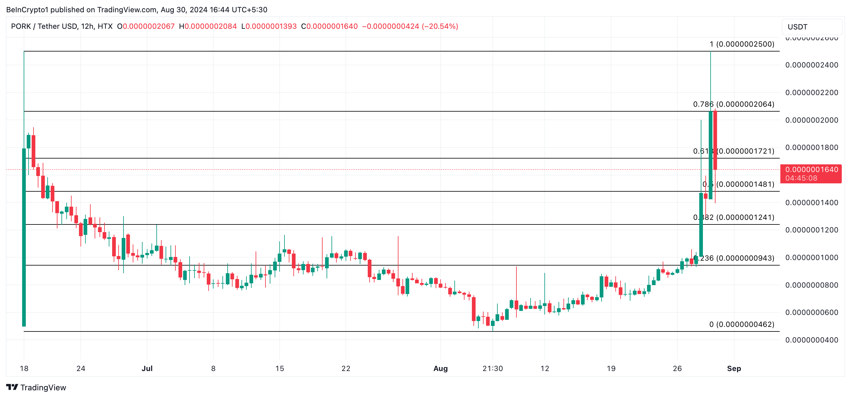 Pepe Fork (PORK) è salito a un massimo di due mesi di 0,00000023 USD durante la sessione di trading intraday di giovedì. Sebbene si sia poi corretto, la meme coin mantiene ancora guadagni a due cifre nelle ultime 24 ore.