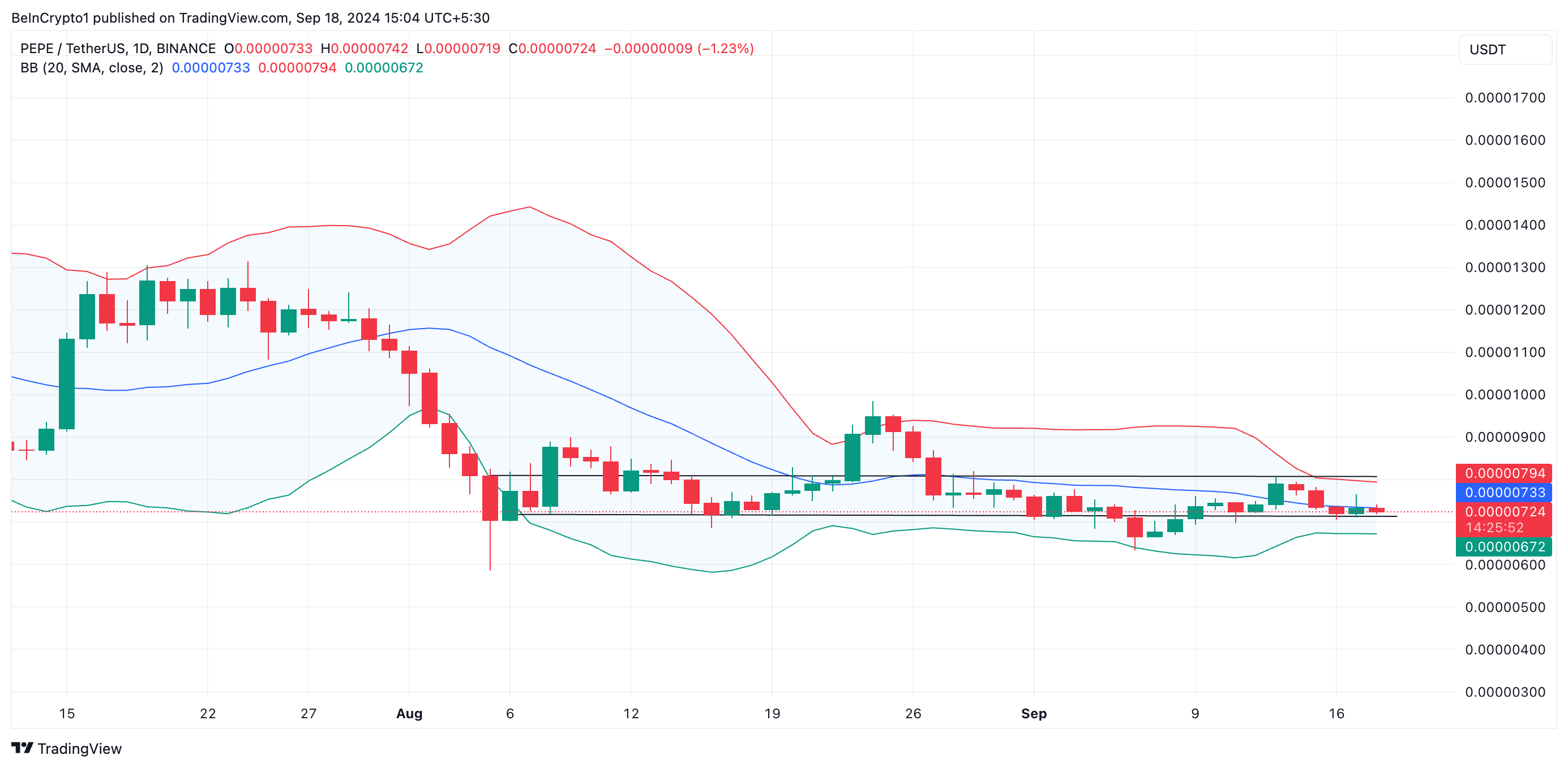 L’analisi di BeInCrypto del prezzo di PEPE sul grafico giornaliero mostra che la moneta meme è stata scambiata all’interno di un canale orizzontale dal 5 agosto. Il prezzo ha costantemente incontrato resistenza a 0,000008 USD e trovato supporto a 0,000007 USD. Questo periodo di trading laterale riflette una diminuzione della volatilità del mercato.