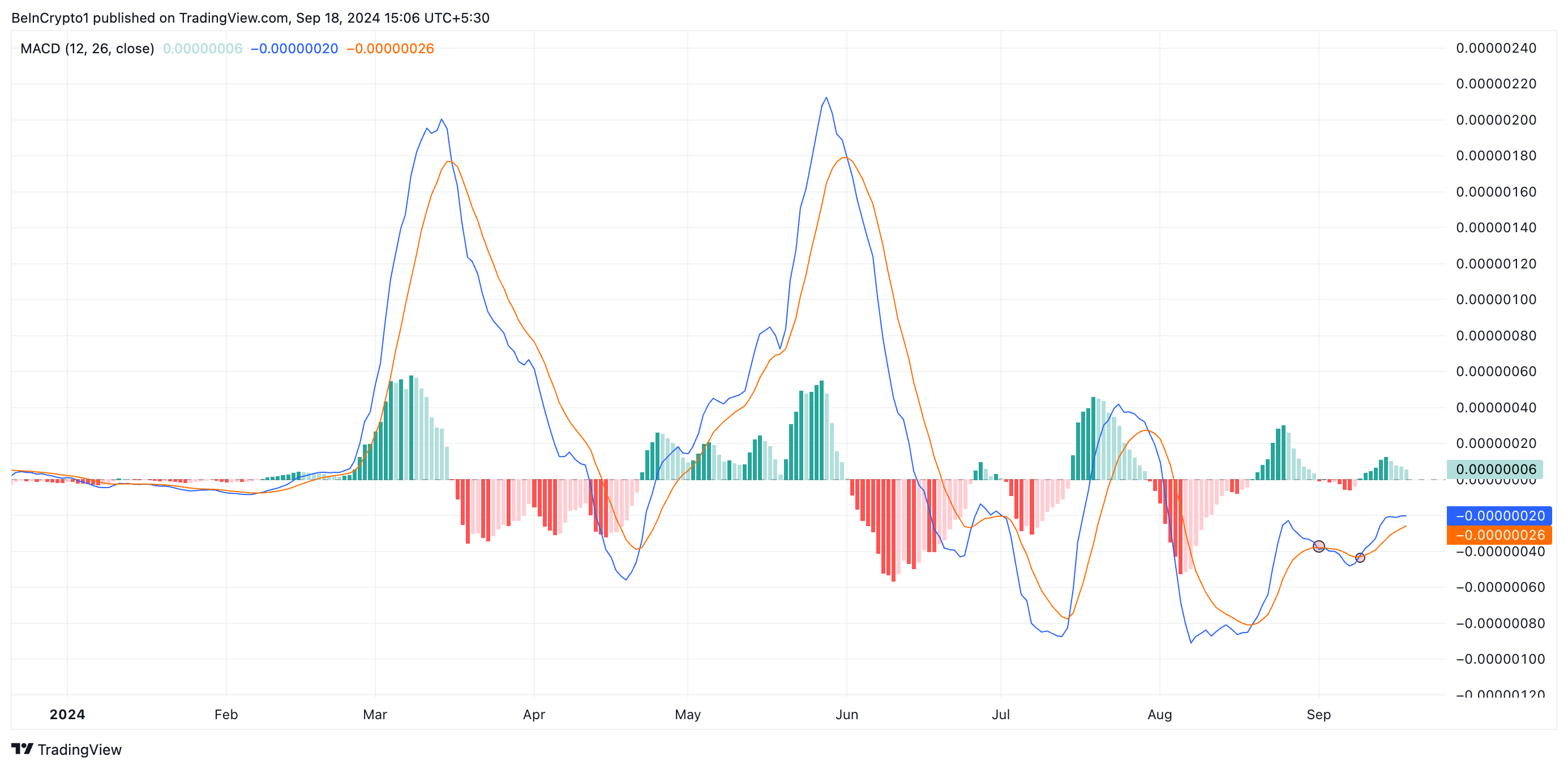 Inoltre, la Convergenza Divergenza delle Medie Mobili (MACD) di PEPE ha mostrato frequenti incroci tra la linea MACD (blu) e la linea segnale (arancione) dall’inizio del mese. Questi ripetuti incroci evidenziano la fase di consolidamento della moneta, dove né i tori né gli orsi hanno ottenuto il controllo chiaro del mercato.