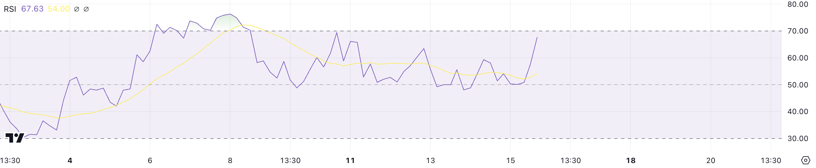 L’Indice di Forza Relativa (RSI) misura la velocità e il cambiamento dei movimenti dei prezzi. Varia da 0 a 100, con valori sopra 70 che indicano condizioni di ipercomprato e sotto 30 che suggeriscono condizioni di ipervenduto. Con l’RSI di GOAT vicino a 70, segnala che l’asset potrebbe essere sovraesteso.