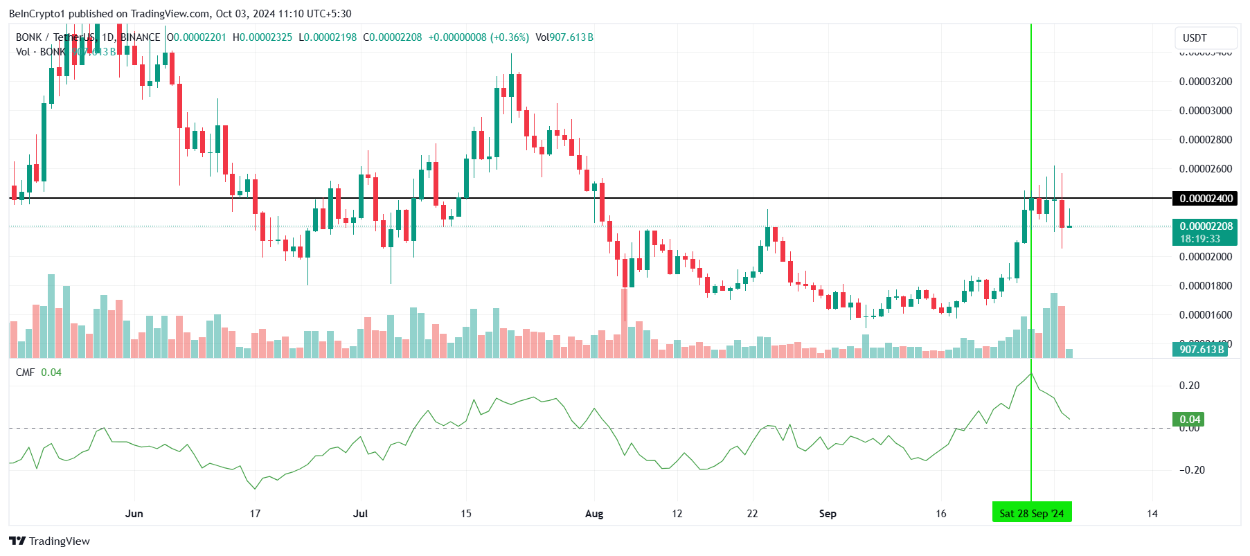 L’indicatore Chaikin Money Flow (CMF) aveva registrato un aumento da inizio settembre, segnalando un incremento dei capitali in BONK. Questo era un segno positivo, poiché suggeriva che gli investitori stavano guadagnando fiducia nel potenziale del memecoin. Tuttavia, proprio mentre BONK si avvicinava a una svolta dalla resistenza critica a 0,00002400 USD, il CMF ha iniziato a mostrare un calo.