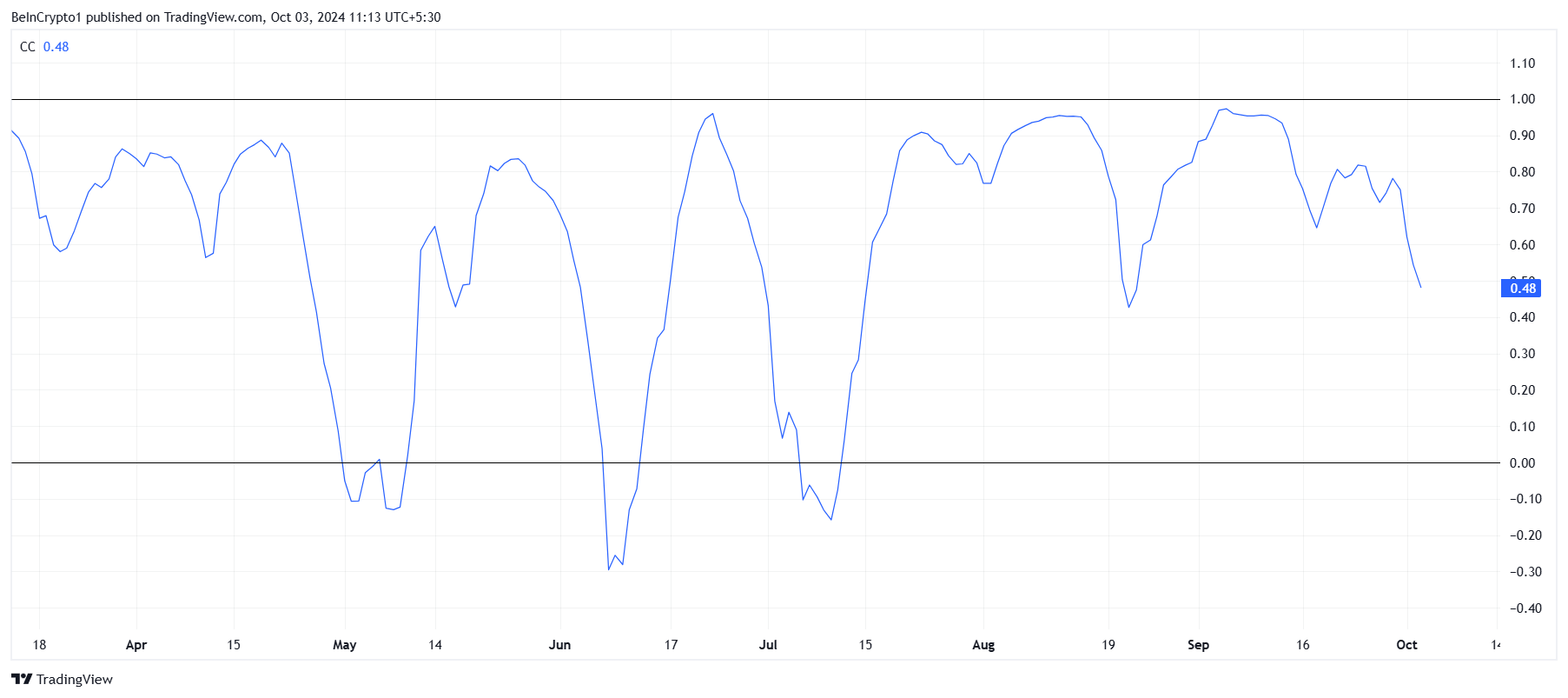 SponsoredIl momento macro più ampio per BONK presenta anche sfide. La correlazione di BONK con Bitcoin è in calo costante, attualmente a 0,48.