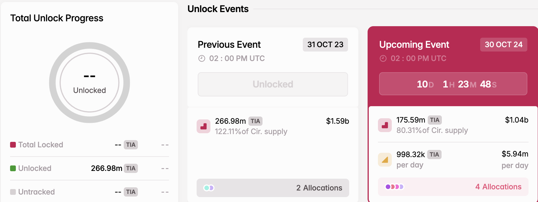 Tra 10 giorni, il progetto di blockchain modulare Celestia (TIA) rilascerà l’80,77% della sua fornitura circolante, valutata a 1,05 miliardi di USD. Questo imminente rilascio di token ha suscitato preoccupazioni riguardo alla possibile pressione di vendita, che potrebbe influenzare il prezzo di TIA.
