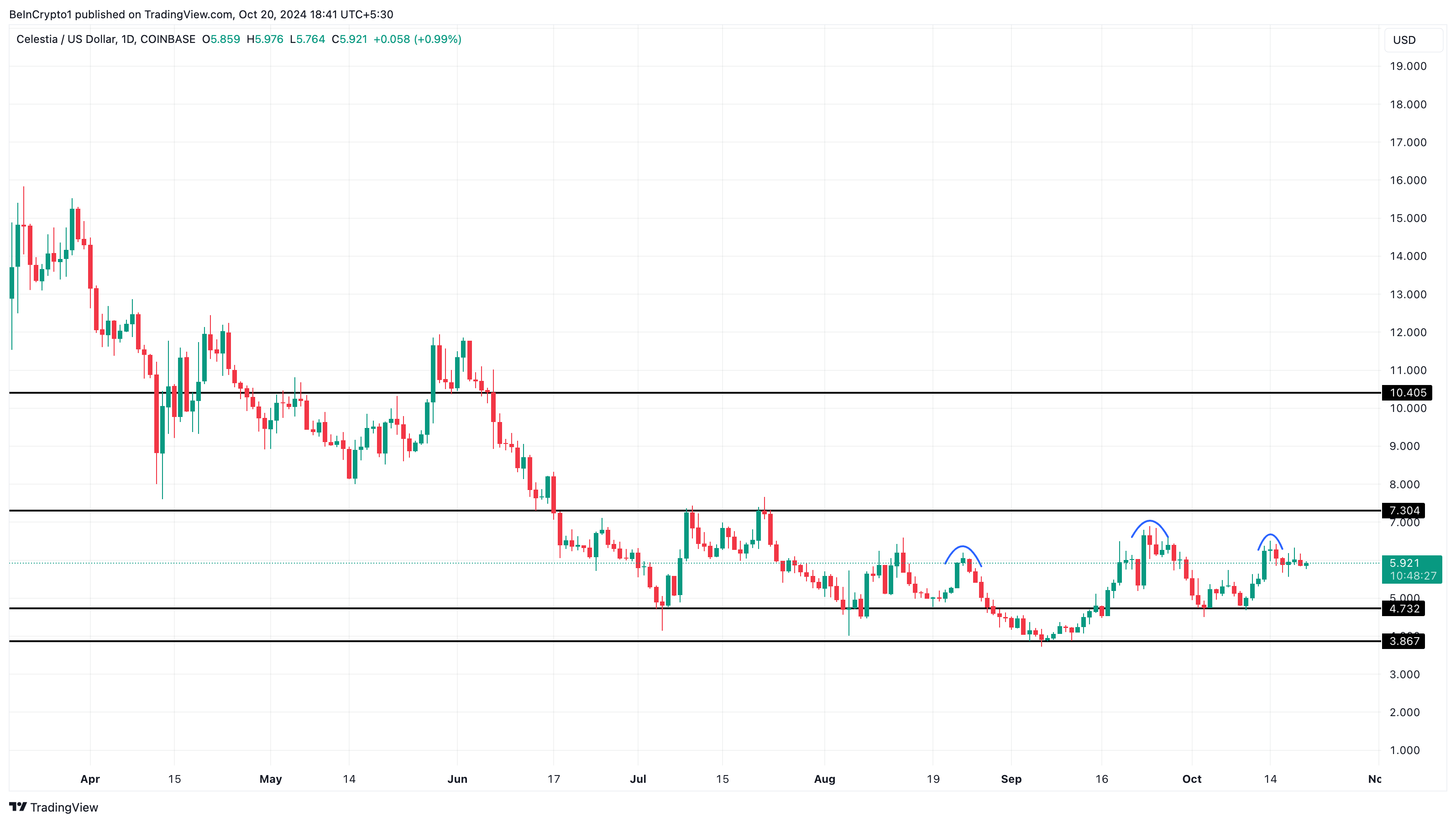 Tipicamente, quando il prezzo di un asset scende sotto la linea del collo del pattern, appare una significativa correzione. D’altra parte, una salita sopra la linea del collo invalida questa previsione. Basandosi sul grafico sotto, sembra probabile che il prezzo di Celestai scenda sotto la linea del collo a 4,73 USD.