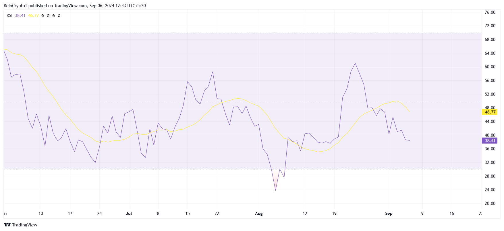 Un RSI in diminuzione sotto il livello 50,0 segnala che il momento ribassista si sta intensificando. Questo declino continuato potrebbe portare a un aumento dell’attività di vendita, causando un ulteriore calo del prezzo di LINK mentre il mercato delle criptovalute rimane cauto.