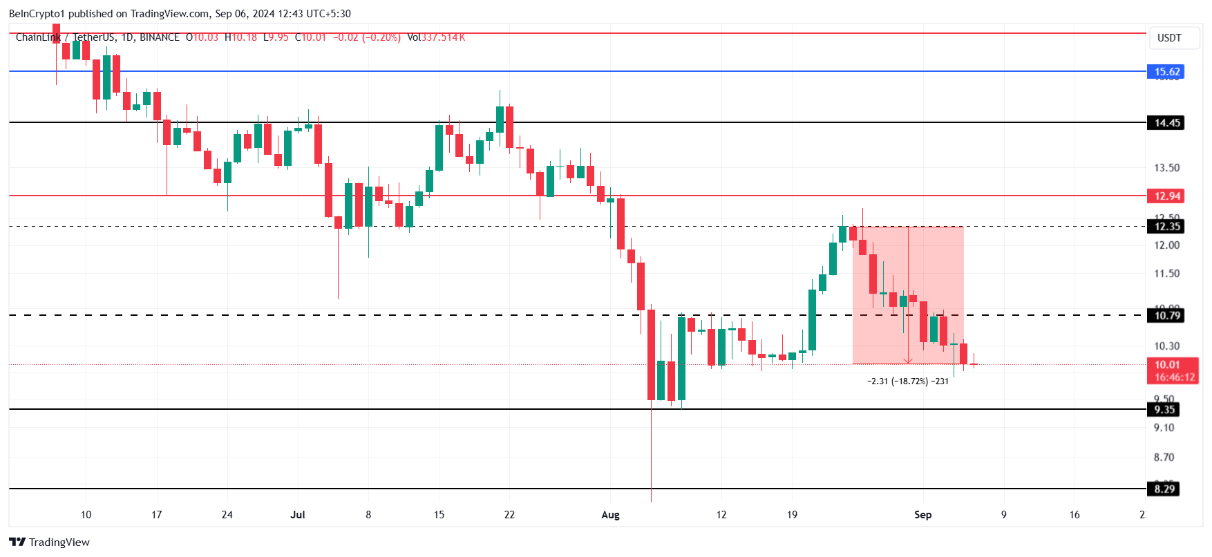 Il prezzo di Chainlink (LINK) ha subito una significativa diminuzione recentemente, annullando la maggior parte dei guadagni fatti durante agosto. Dopo un periodo di crescita, l’altcoin è ora sceso del 18% in soli 12 giorni e si avvicina a un livello di supporto critico.