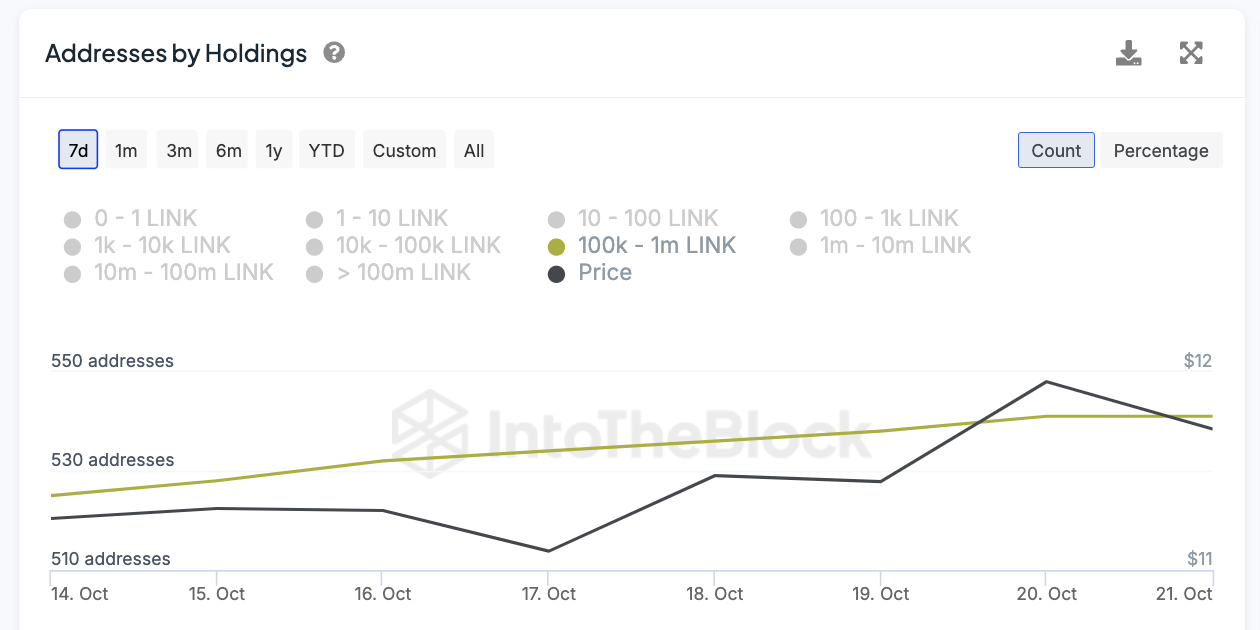 Il numero di indirizzi che detengono tra 100.000 e 1.000.000 LINK è aumentato costantemente nell’ultima settimana, passando da 525 il 14 ottobre a 541 il 20 ottobre. Questo accumulo da parte delle whales ha coinciso con l’aumento del prezzo di LINK da 11,26 USD a 11,95 USD nello stesso periodo.