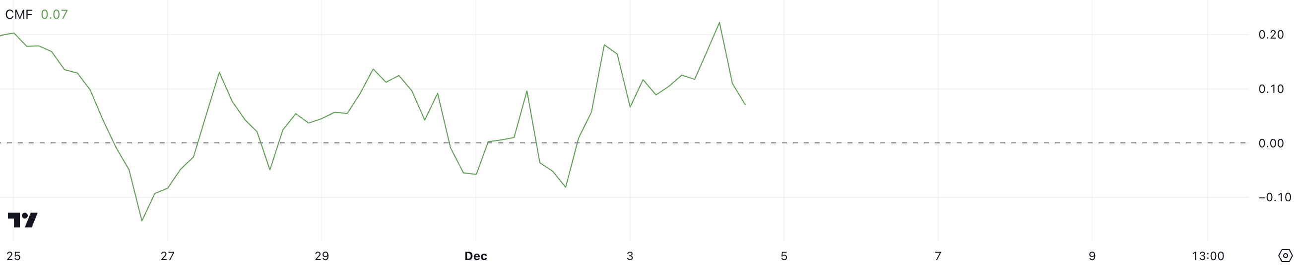 Il CMF (Chaikin Money Flow) di DOT è attualmente a 0,07, in calo da un recente picco di 0,22, il livello più alto dal 23 novembre. Questo calo suggerisce che, sebbene la pressione d’acquisto rimanga in gioco, si è indebolita rispetto alla sua intensità precedente.