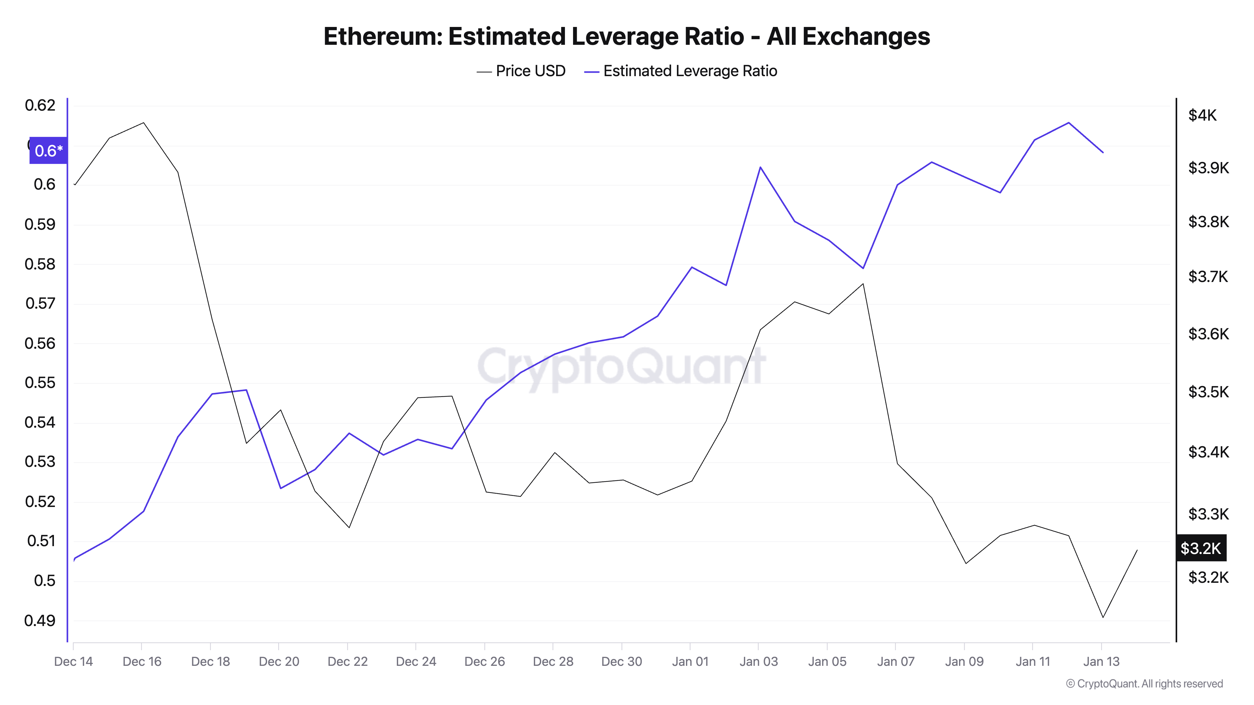 Un indicatore è l’aumento del rapporto di leva stimato (ELR) di ETH. Secondo CryptoQuant, questo indicatore ha mantenuto una tendenza al rialzo nonostante il calo del prezzo di ETH nelle ultime settimane. A 0,60 al momento della stampa, l’Estimated Leverage Ratio (ELR) di ETH è aumentato del 20% nell’ultimo mese, nonostante un calo del 15% del suo prezzo nello stesso periodo.