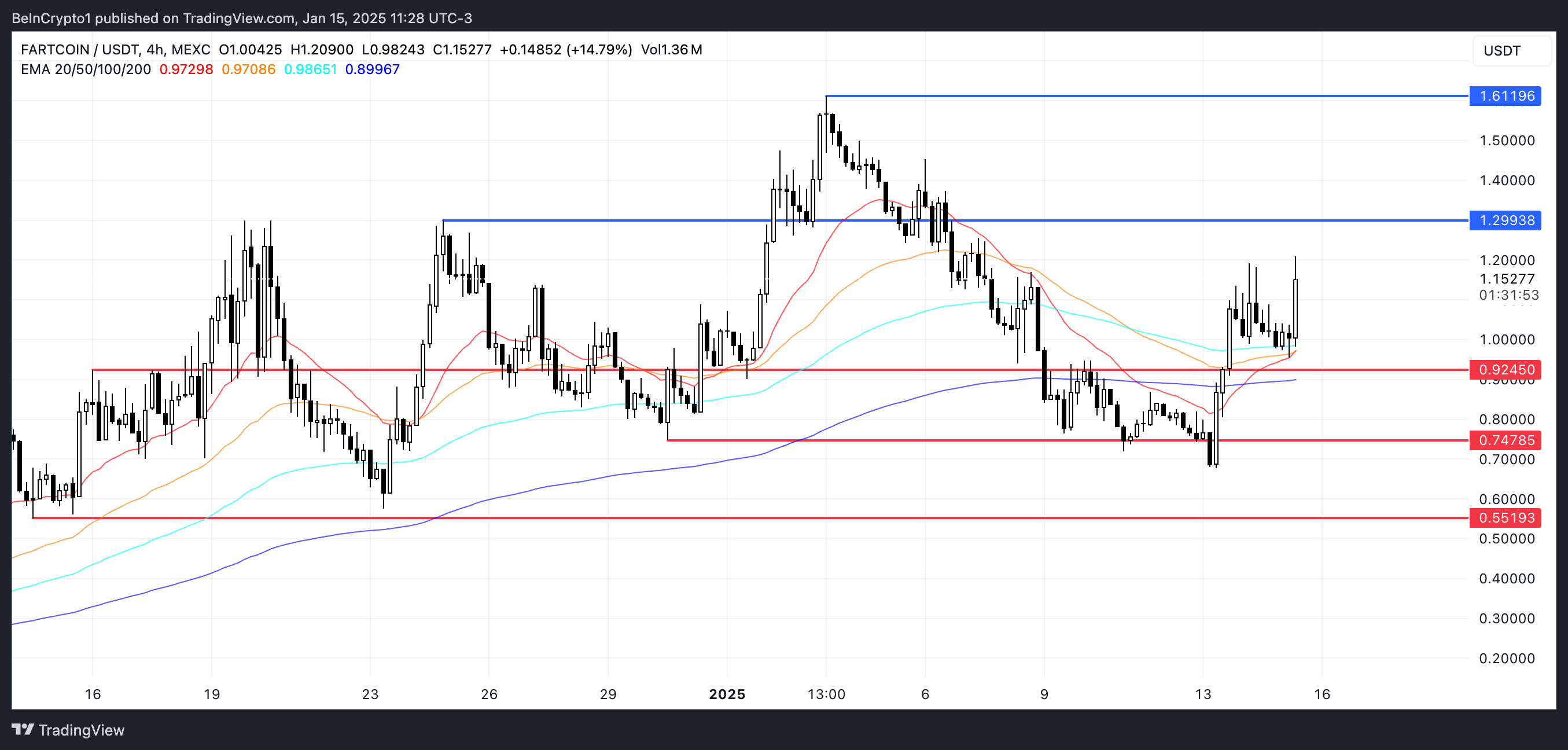 FARTCOIN le linee EMA mostrano una configurazione rialzista, con l’EMA a breve termine che attraversa sopra l’EMA a lungo termine per formare un golden cross. Questo pattern spesso segnala un potenziale trend rialzista, e se confermato, FARTCOIN potrebbe testare la resistenza a 1.299 USD.