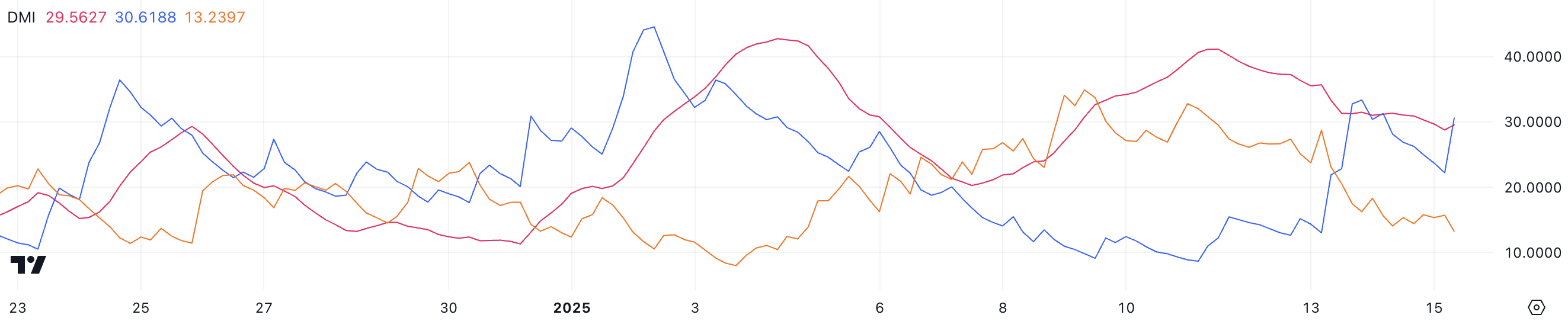 FARTCOIN DMI mostra il suo ADX a 29.5, in calo rispetto a 41.1 di quattro giorni fa. Questo indica una diminuzione della forza del trend mentre il mercato passa da un trend ribassista a uno rialzista.