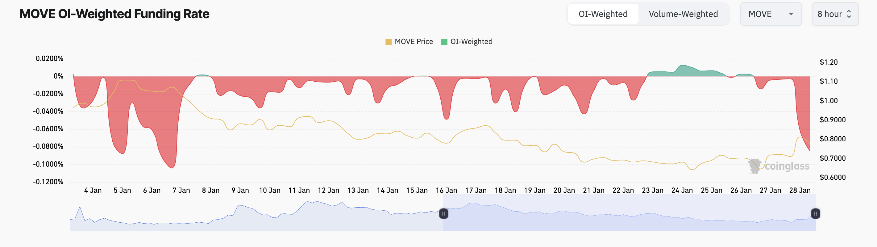 Un tasso di finanziamento negativo significa che i trader short stanno pagando i trader long, indicando che il sentimento del mercato è ribassista nonostante il rally del prezzo. Questo suggerisce che il rally di MOVE è guidato da short squeeze piuttosto che da una forte domanda organica, mettendo in dubbio la sostenibilità del rally.
