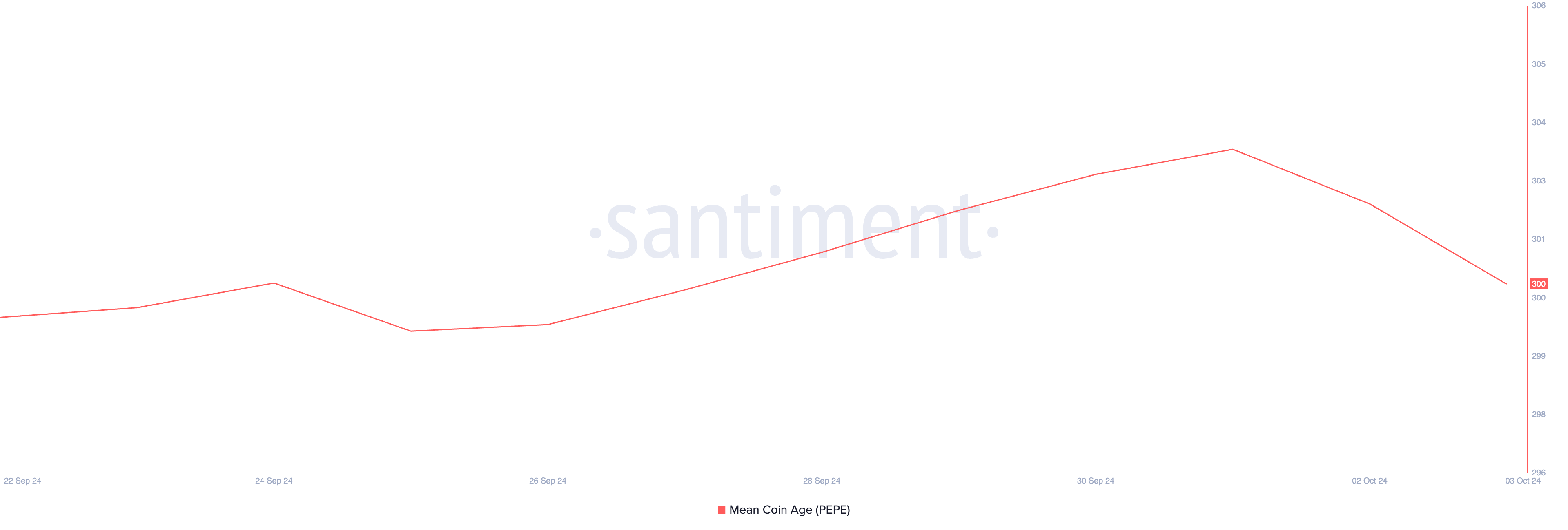 La prima metrica che indica il realizzo di profitti tra i detentori a lungo termine di Pepe (LTHs) è la sua Età Media delle Monete. L’analisi di BeInCrypto mostra che questa metrica è diminuita dell’1% dall’inizio di ottobre, attestandosi attualmente a 300.