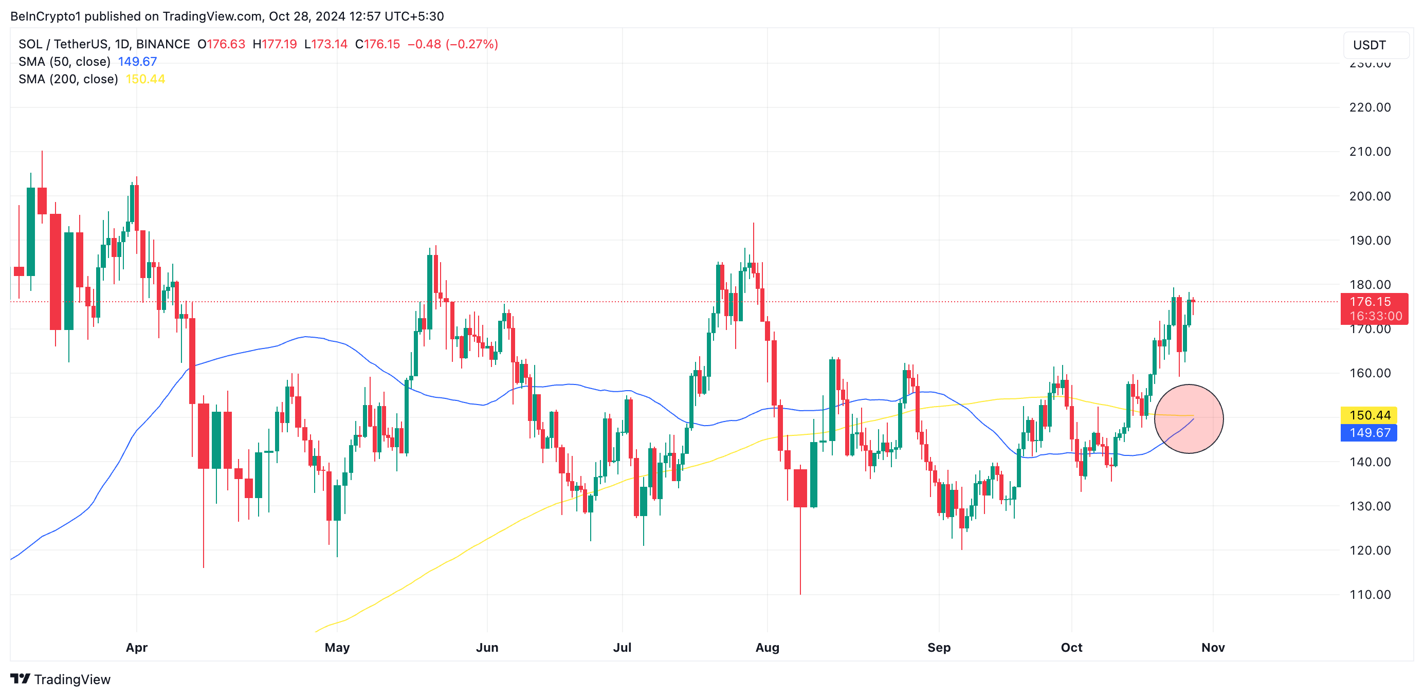 La valutazione di BeInCrypto del grafico giornaliero SOL/USD mostra la sua SMA a 50 giorni (linea blu) sul punto di superare la SMA a 200 giorni (linea gialla).