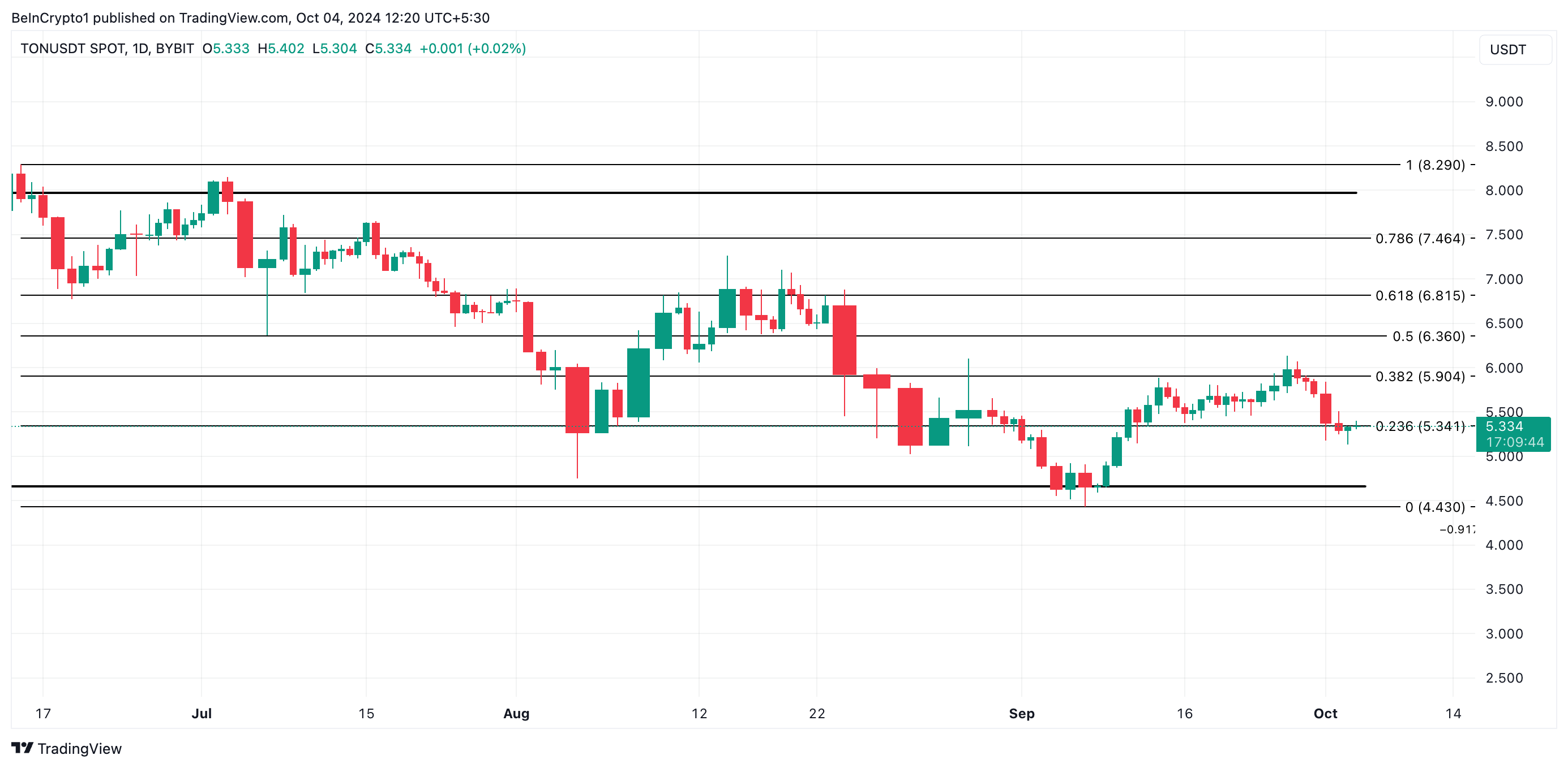 Al momento della stampa, TON si scambia a 5,34 USD e tende verso il limite inferiore del suo canale orizzontale, che ha formato supporto da marzo. È sceso a questa linea all’inizio di settembre ma non è riuscito a romperla poiché i tori hanno potuto difenderla.