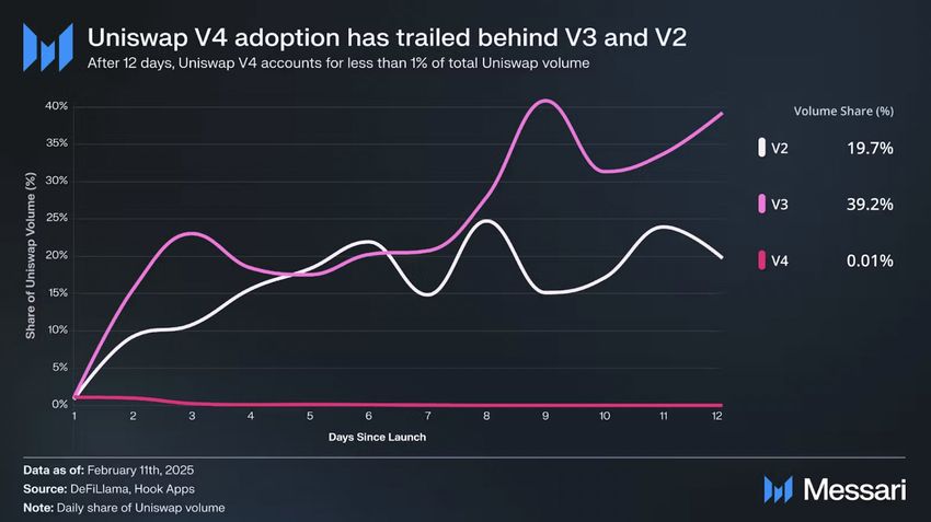 Il lancio del DEX V4 di Uniswap, che era molto atteso dalla comunità , non ha generato il livello di interesse previsto. Il tasso di adozione per V4 è stato molto più lento rispetto alle versioni precedenti, con V4 che attualmente occupa solo lo 0,01% della quota di volume totale di Uniswap. In netto contrasto, V3 e V2 hanno guadagnato rapidamente trazione, catturando rispettivamente il 40% e il 20% della quota di mercato, entro soli 12 giorni dal loro lancio.
